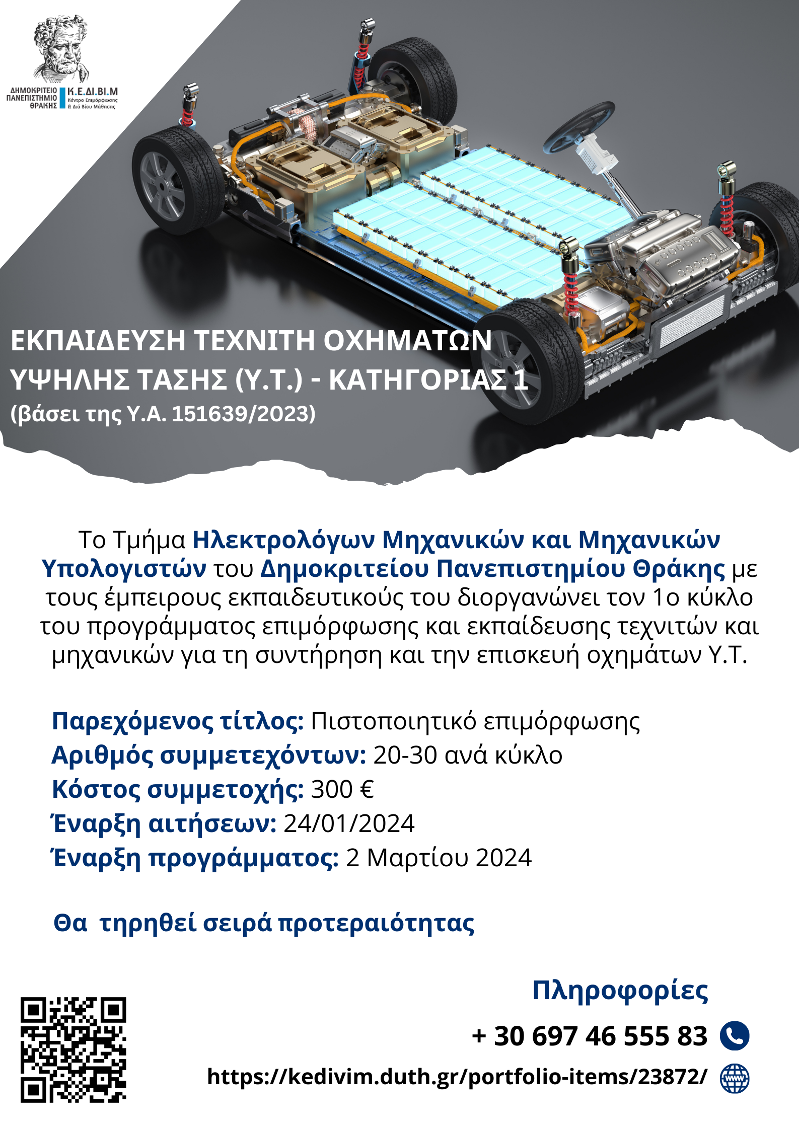 Στις 2 Μαρτίου, στην Ξάνθη το Δημοκρίτειο Πανεπιστήμιο Θράκης ξεκινάει ένα εκπαιδευτικό πρόγραμμα για τεχνίτες οχημάτων υψηλής τάσης. Παρακαλούμε, αν ενδιαφέρεστε, να επικοινωνήσετε με το Πανεπιστήμιο στο τηλέφωνο επικοινωνίας 6974655583