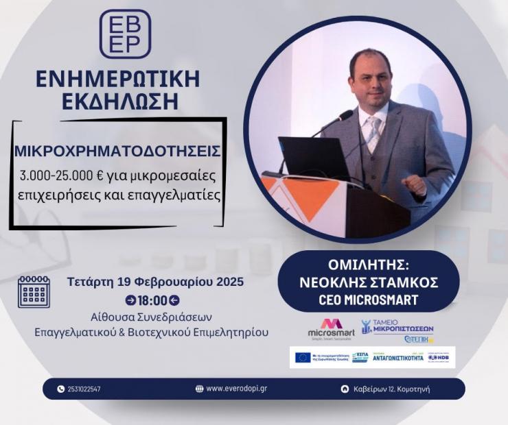Συνεδριάσεων του ΕΒΕ Ροδόπης (Καβείρων 12, 1ος όροφος) ενημερωτική εκδήλωση με θέμα: "Μικροχρηματοδοτήσεις - 3.000 € - 25.000 € για μικρομεσαίες επιχειρήσεις και επαγγελματίες".