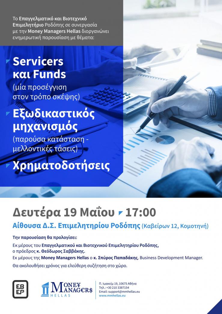 Το Επαγγελματικό και Βιοτεχνικό Επιμελητήριο Ροδόπης, σε συνεργασία με τη Money Managers Hellas, διοργανώνει ενημερωτική παρουσίαση με αντικείμενο καίρια ζητήματα που απασχολούν τις επιχειρήσεις και τους επαγγελματίες: