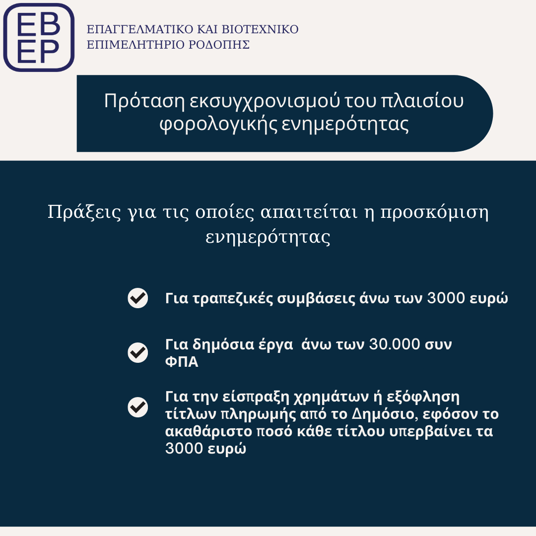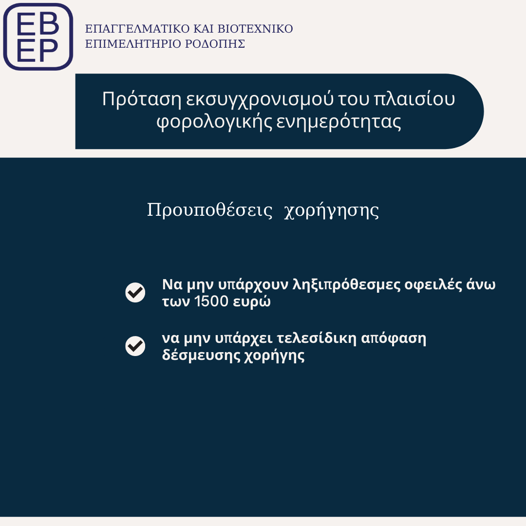 Έπειτα από παρέμβαση του Προέδρου του Επαγγελματικού και Βιοτεχνικού Επιμελητηρίου Ροδόπης το Νοέμβριο στη Γενική Συνέλευση της Κεντρικής Ένωσης Επιμελητηρίων Ελλάδος και προσωπικά στο Διοικητή της ΑΑΔΕ, κ.Πιτσιλή, για την ανάγκη αναμόρφωσης του πλαισίου για τη φορολογική ενημερότητα, η ΑΑΔΕ ξεκίνησε δημόσια διαβούλευση για τον εκσυγχρονισμό του.