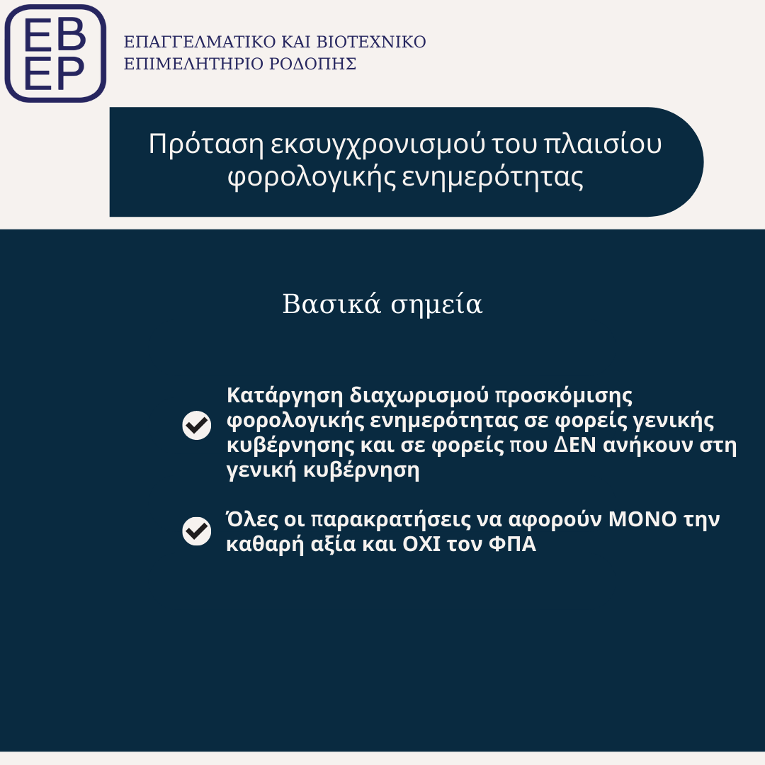 A) Η κατάργηση του διαχωρισμού έκδοσης φορολογικής ενημερότητας σε φορείς της Γενικής Κυβέρνησης και σε φορείς που δεν ανήκουν στην Γενική Κυβέρνηση,