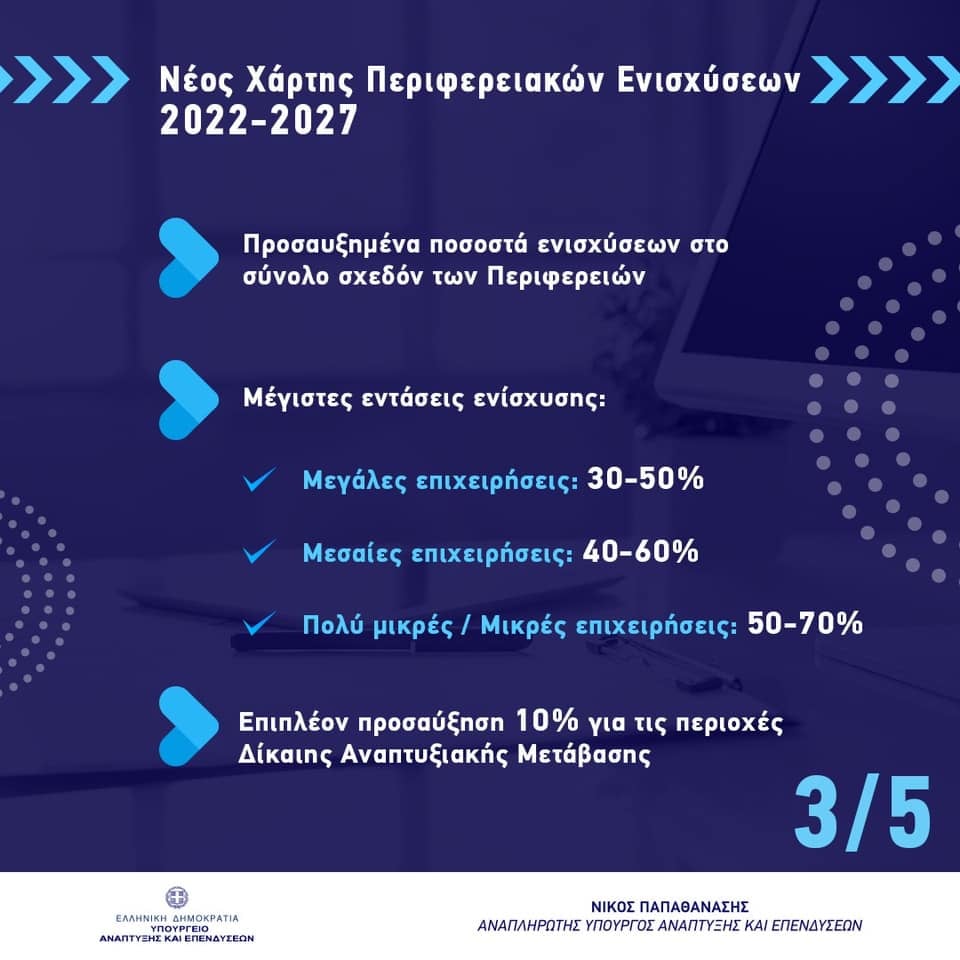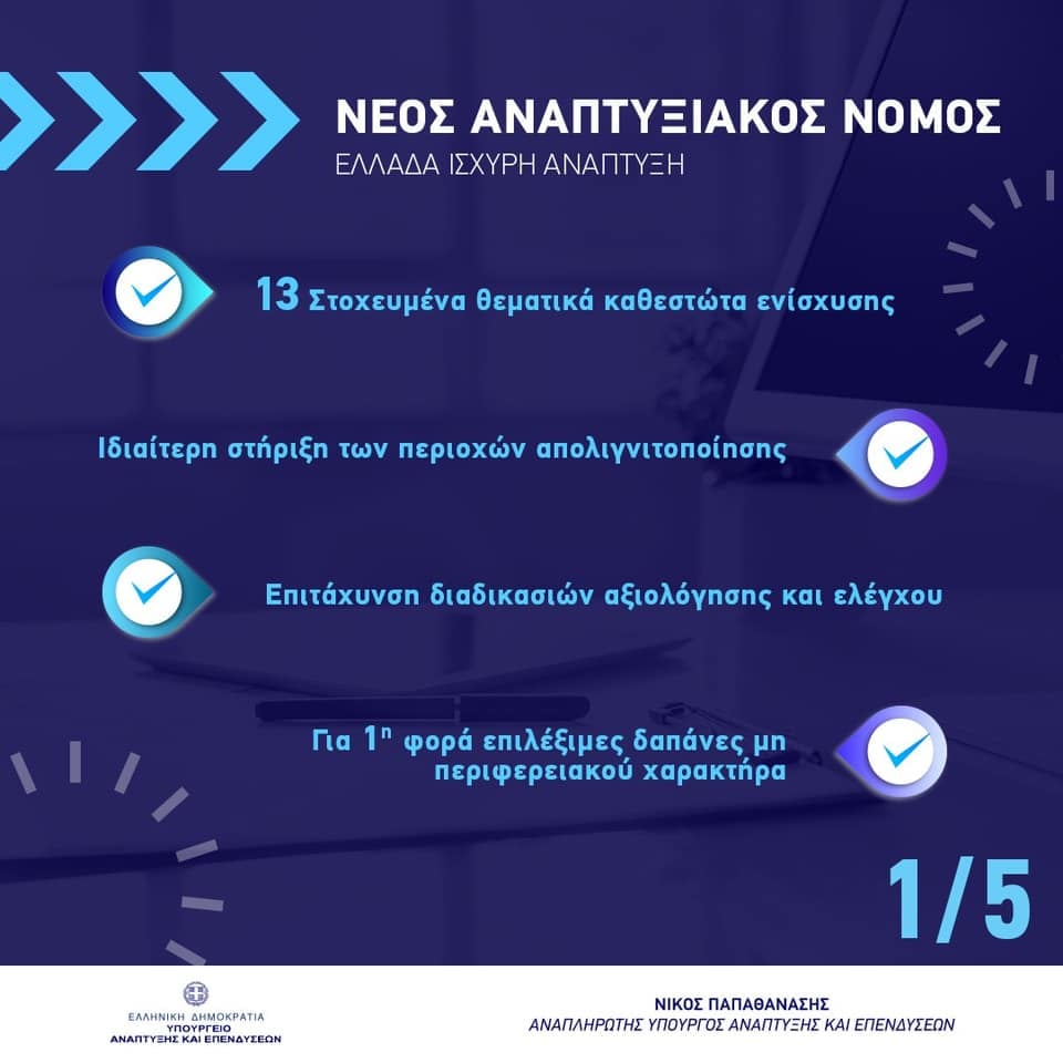 «Ο νέος αναπτυξιακός νόμος αποτελεί συνέχεια της εθνικής αναπτυξιακής μας στρατηγικής. Ευθυγραμμίζεται πλήρως με το Εθνικό Σχέδιο Ανάπτυξης για την ελληνική οικονομία που συνέταξε η Επιτροπή Πισσαρίδη και το Εθνικό Σχέδιο Ανάκαμψης και Ανθεκτικότητας Ελλάδα 2.0. Αξιοποιεί τον νέο Χάρτη Περιφερειακών Ενισχύσεων 2022-2027 και εναρμονίζεται με τους εθνικούς μας στόχους για το ΕΣΠΑ 2021-2027 και την ενεργή συμμετοχή της χώρας στην 4η Βιομηχανική Επανάσταση.