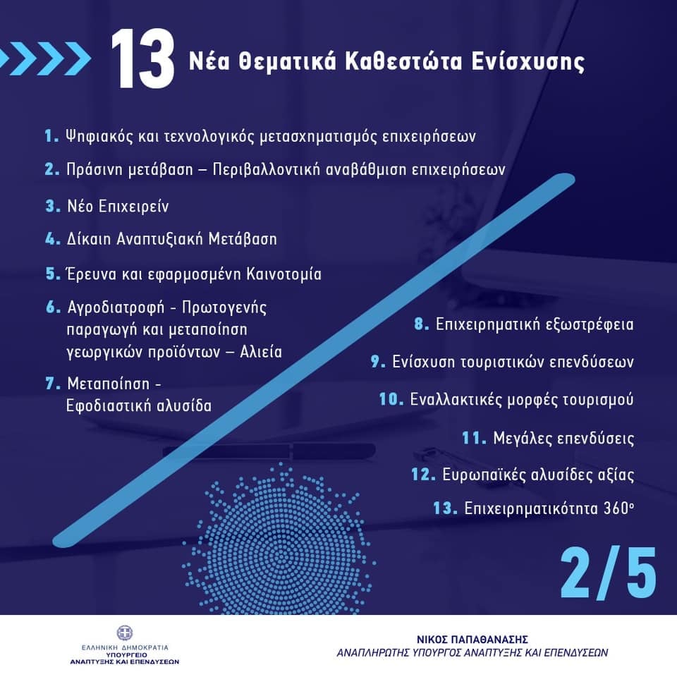 Ανταποκρινόμενοι στις σύγχρονες ανάγκες δημιουργήσαμε 13 συνολικά θεματικά καθεστώτα ενίσχυσης σε διαφορετικούς τομείς οικονομικής δραστηριότητας, καλύπτοντας σχεδόν ολόκληρο το φάσμα της επιχειρηματικότητας. Οι άξονες στους οποίους κινείται ο νέος αναπτυξιακός είναι: η πράσινη μετάβαση, ο ψηφιακός μετασχηματισμός, η έρευνα και η καινοτομία, η ενίσχυση της εξωστρέφειας, η ενίσχυση της απασχόλησης και των δεξιοτήτων, η αγροδιατροφή και η αλιεία.